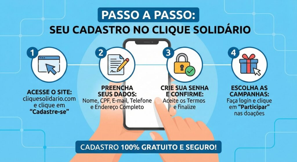 Não se preocupe. Criamos este guia definitivo para pegar na sua mão e te ajudar em cada etapa do processo. O cadastro no Clique Solidário é rápido, simples e, o mais importante, totalmente gratuito.